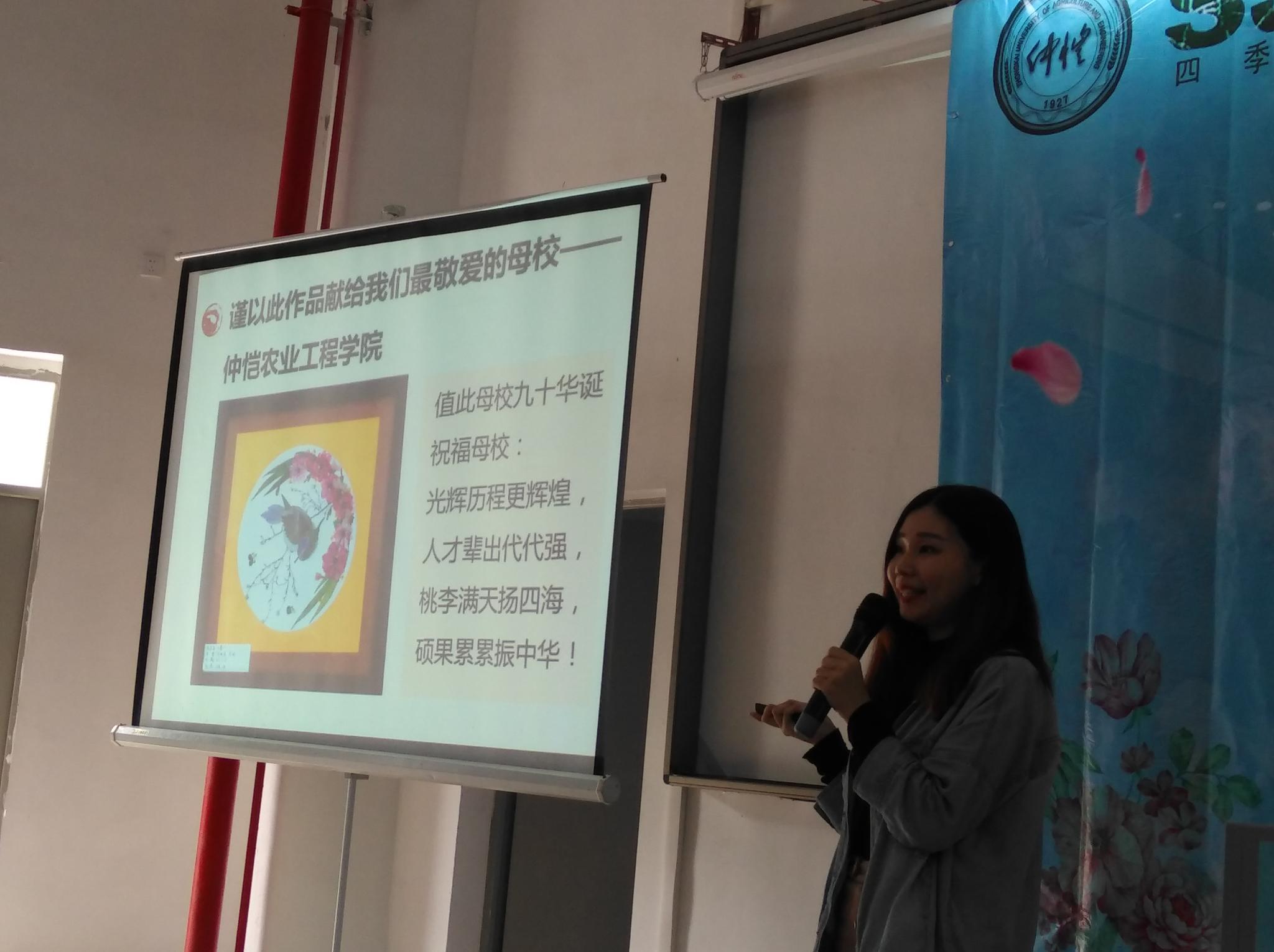 其中,不少选手特别通过自己的作品表达了对学校建校90周年的美好祝愿,如作品《空谷幽兰》取兰花象征廖仲恺、何香凝先生坚持原则、威武不屈、贫贱不移、廉洁奉公、不断进步、勇于牺牲的革命精神和高尚品德,并借作品表达仲园莘莘学子对学校的感激和热爱;作品《春》为为仲恺母校写下祝福词:光辉历程更辉煌,人才辈出代代强,桃李满天扬四海,硕果累累振中华,表达学子对学校90周年校庆的真挚情感。