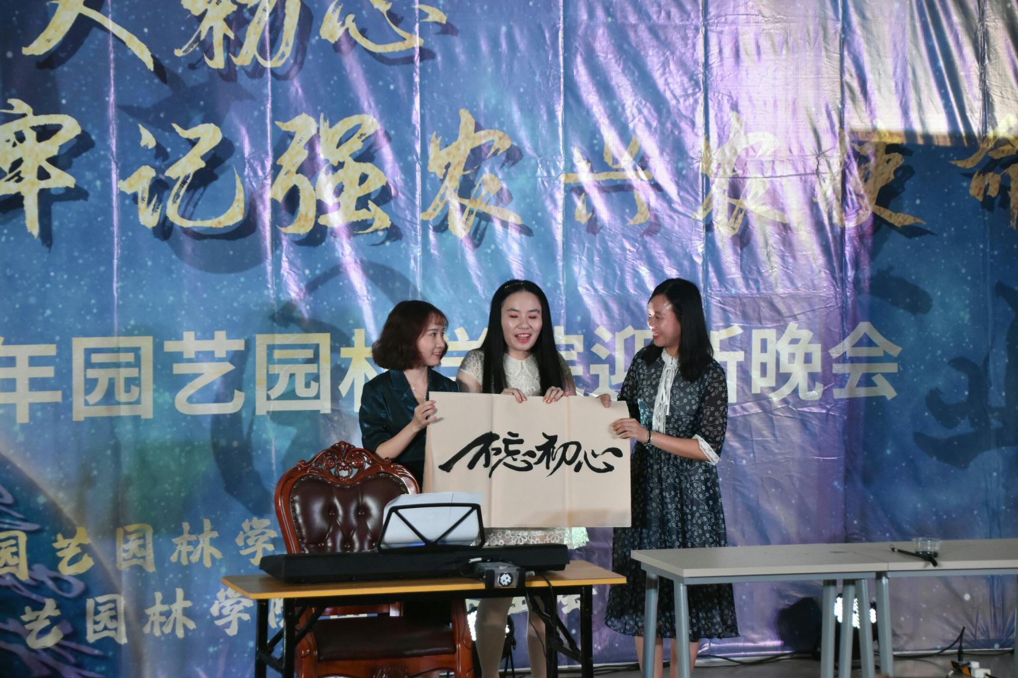 接着是夏涵涵老师、谈静老师、程莉莎老师精心准备的节目:纯音乐《天之痕》。伴随着琴声和二胡声,程莉莎老师用苍劲有力的书法诠释了对祖国的热爱。曲毕,“不忘初心”四个大字恰好完美地展现在宣纸上,在场的观众无不拍手称赞。