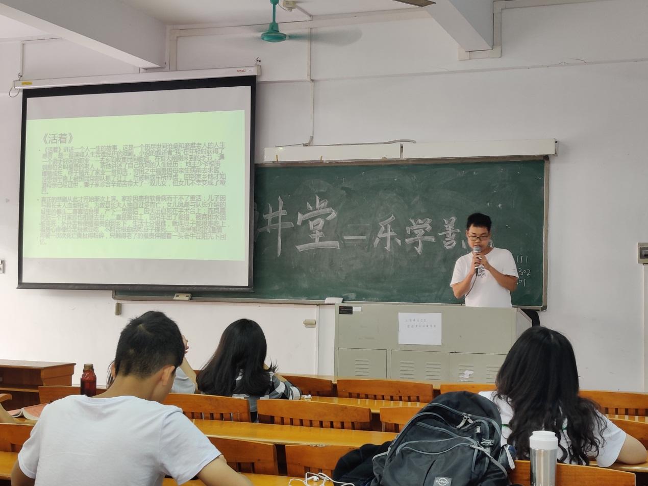 第一位分享人是陈柳成同学,他首先介绍了我国现代著名的作家余华,接着就余华作家本人的作品进行了分享。他以故事的形式给同学们讲述了《活着》与《第七天》两本书,给同学们传授知识的同时,又引发了同学们对生命的思索。