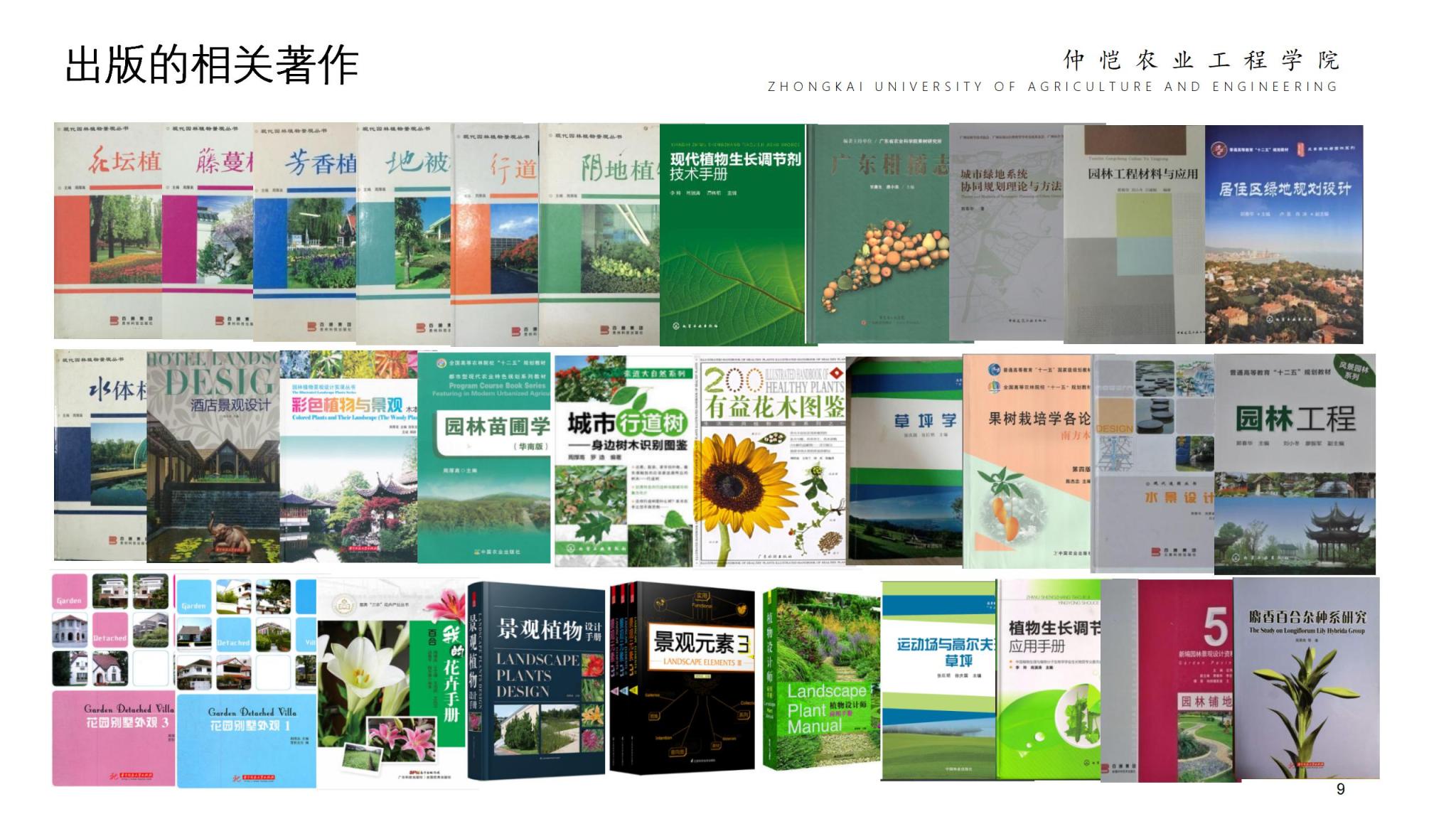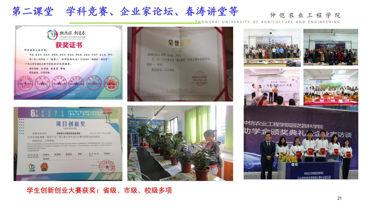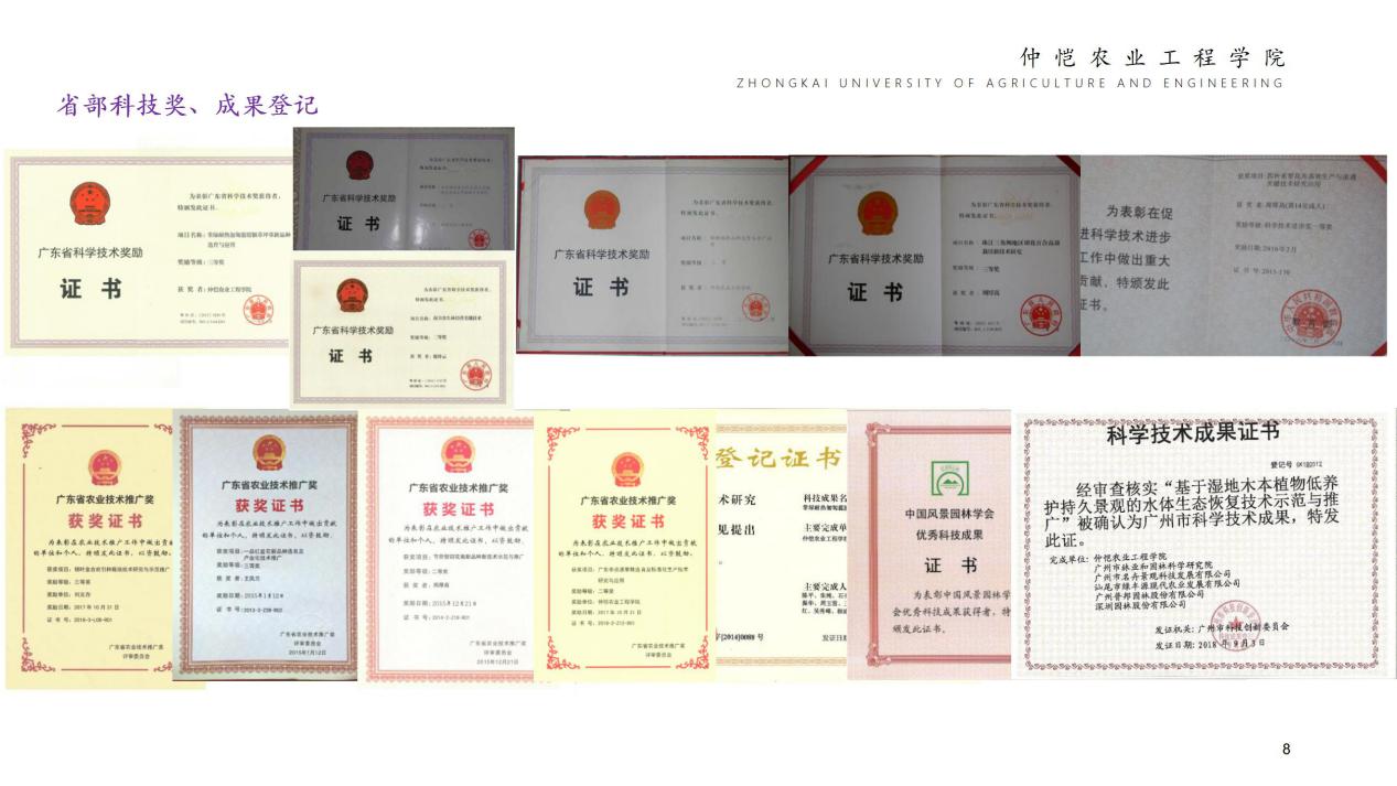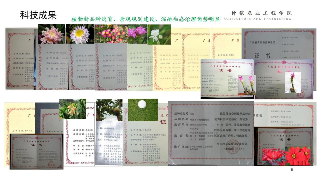 学院全体教职工辛勤耕耘在教学、科研和社会服务的第一线,在农业生产、生态修复、园艺花卉产业内享有盛誉,在教学、科研和学生管理等取得可喜的成绩:主持国家和省部级科研课题30多项,发表高水平研究论文200多篇,出版专著和教材25部,培育植物新品种20个,获国家发明专利7项,开发实用技术15项,获省级和市级科技奖共7项;荣获广东省教育教学成果奖一等奖2项、二等奖1项,校级教育教学成果特等奖1项、一等奖1项;荣获广东省大学生挑战杯二等奖1项、三等奖1项、广东省优秀学生会、广东省大学生社会实践优秀团队等荣誉称号。