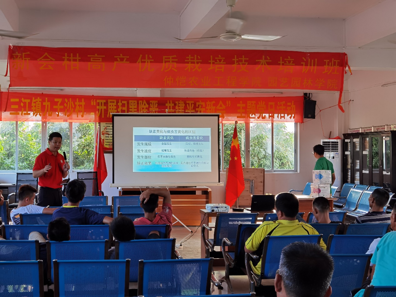 19日柑橘小分队依次走访四家个体经营的新会柑柑橘园。通过对不同种类果园的产量、成本、效益、水肥管理、植株的修剪等情况进行对比,队员们总结出新会柑散户种植主要存在的问题:一、由于管理相对粗放,对于水肥的把控和植株的修剪仅凭经验,植株品质欠佳,年产量不够稳定;二、受传统农业耕作技术限制,产量受自然条件影响较大。在走访调研的过程中,农户们十分热情好客,积极地与小分队进行讨论,涂老师也就上述问题进行了技术指导,给果农们提出专业建议。涂老师在指导果农的同时,也给队员们上了一堂实操课,队员们真正体会到学以致用的内涵。为了让更多的农户了解种植新会柑的专业知识,涂老师在九子沙村村委开展了“新会柑优质栽培技术培训班”,现场为当地的农户答疑解惑。