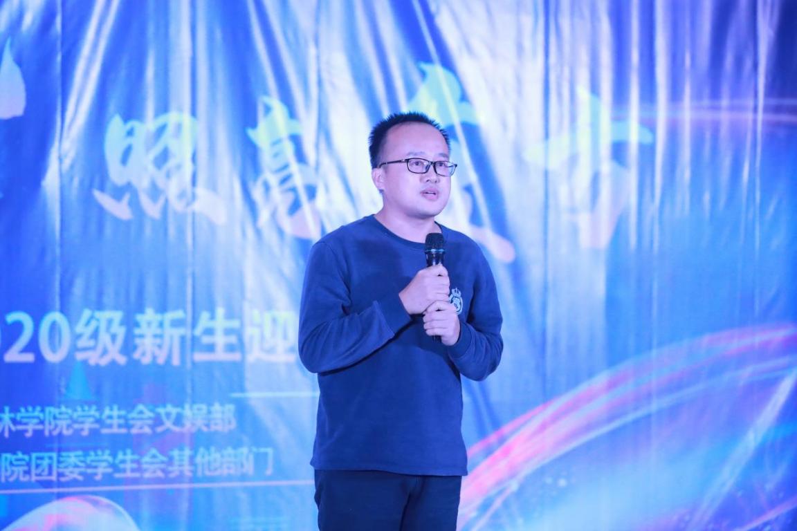 石利刚副书记在晚会上发表了讲话。他代表学院全体老师欢迎2020级同学的到来,并即兴高歌一曲表达他与同学们齐聚一堂的喜悦心情。同时,他不忘叮嘱同学们注意疫情防控。