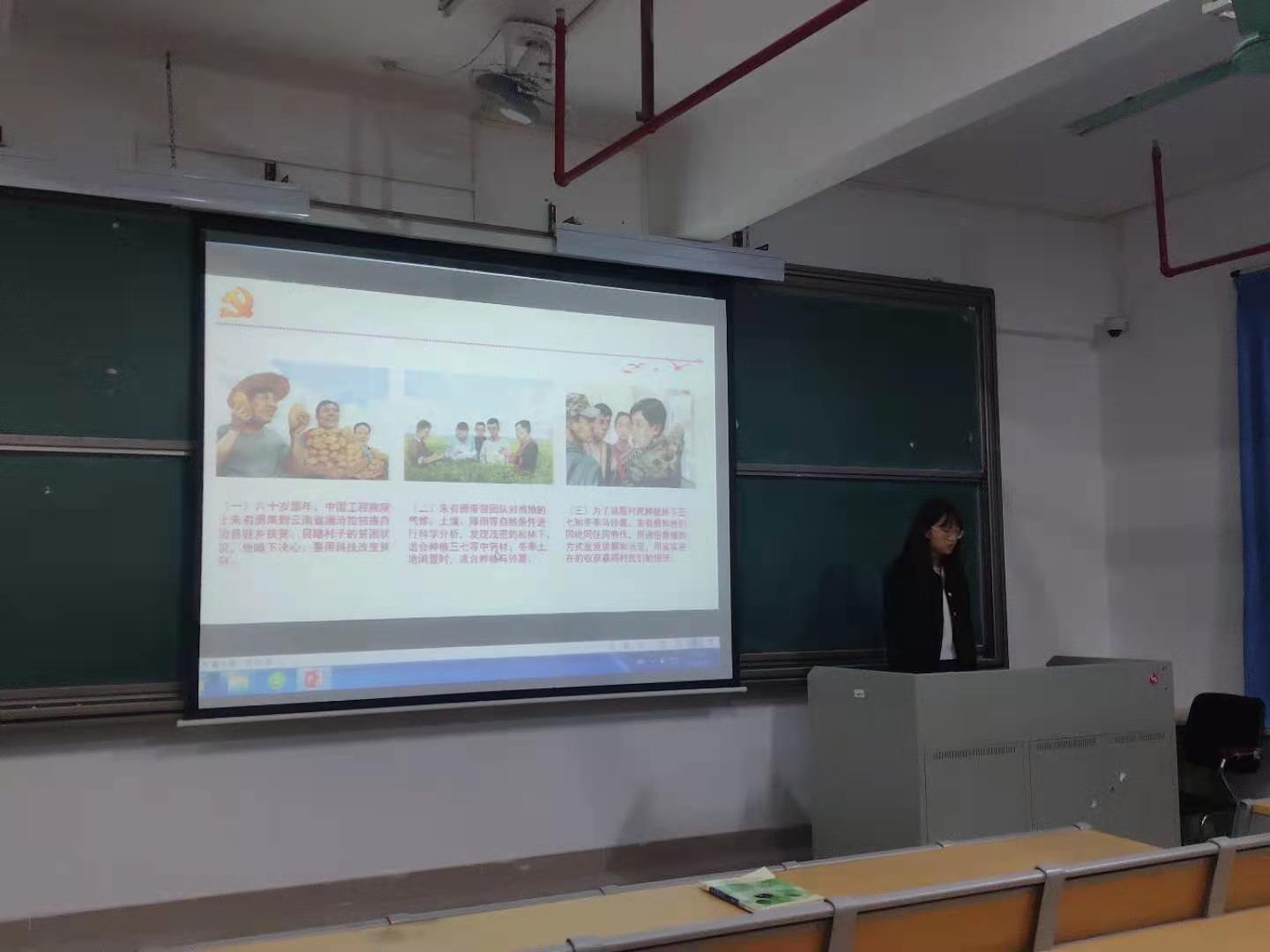 宣讲会伊始,宣讲人陈瑛师姐带领同学们回顾了党的十九届四中全会以来的工作成果,其中包括疫情期间党中央带领人民战胜各种风险挑战,决胜全面建成小康社会取得决定性成就等,并介绍了为农民服务的农民院士朱有勇、疫情中的逆行者钟南山院士等值得同学学习的人民榜样的光荣事迹。