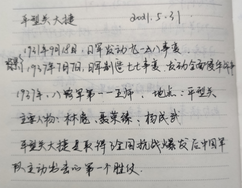 欧阳楚洁同志说道:平型关大捷是全面抗战爆发后,共产党八路军为配合正面国民党军队作战主动寻歼敌人所取得的第一个重大胜利,打破日军战无不胜的神话,这极大地鼓舞了全国军民的抗战信心。八路军战士顽强无畏的战斗精神感染着我,也鼓舞着我。而且我们也在从中可以学到:当遇到比我们强大的敌人时,我们要根据现有的资源来最大化地减少损失,从而达到扭转战局的目的。正是因为这些英勇战士的流血牺牲,才换来我们今天的幸福生活,我们更应该珍惜它。
