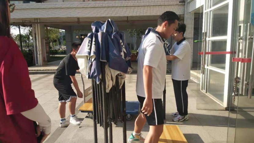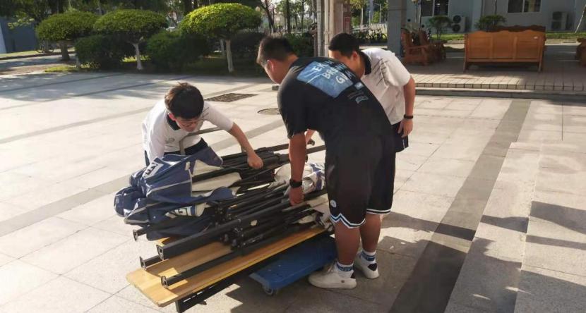 活动当天早上7点,学生党员和积极分子在刘宇新楼412进行所需物资的整理,确保物资种类和数量准确无误,整理完毕后用小推车将帐篷等物资从刘宇新楼运送到操场。