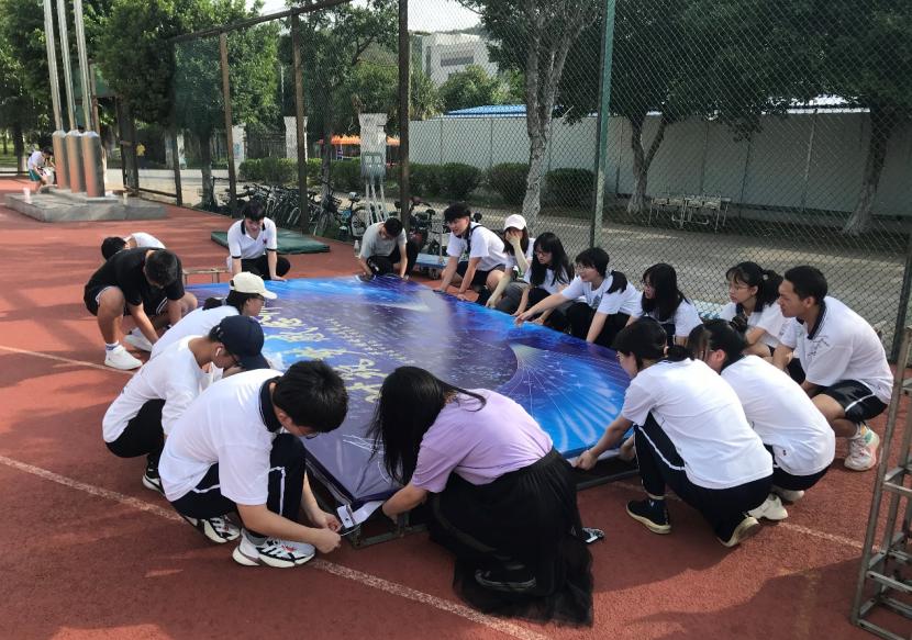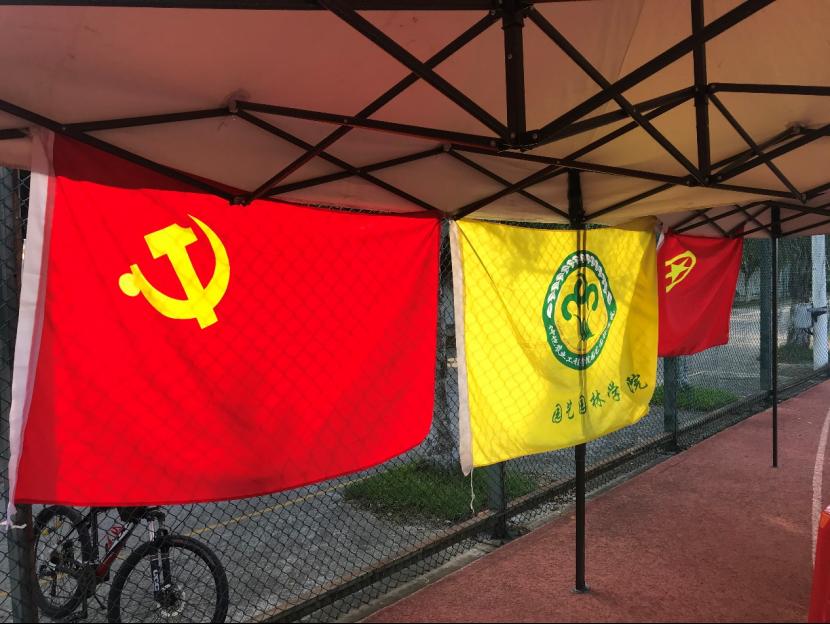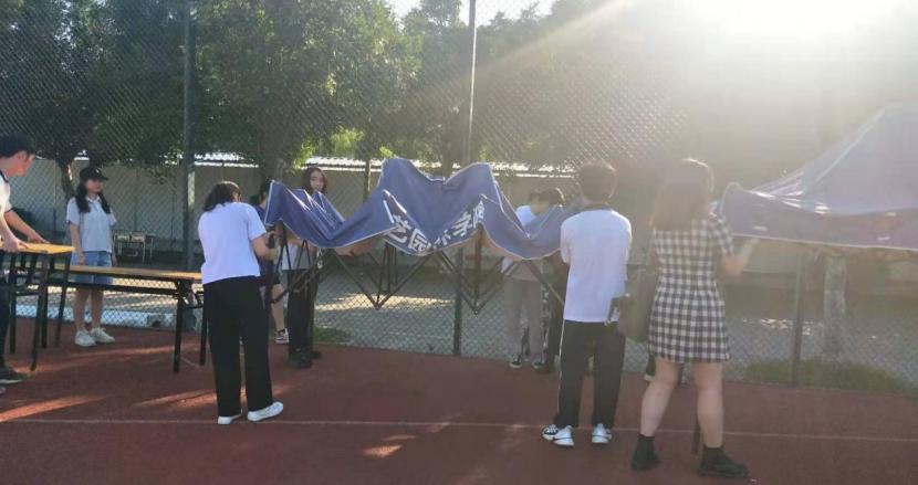 将物资运送到操场之后,学生党员和积极分子在大本营进行帐篷搭建、横幅悬挂、签名墙架子安装等场地布置工作,在大家的共同努力下,于早上8点半基本完成大本营的搭建工作。