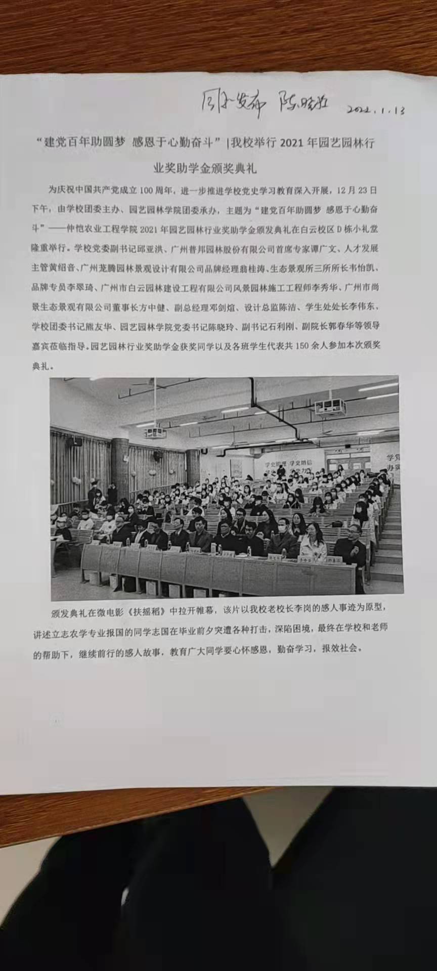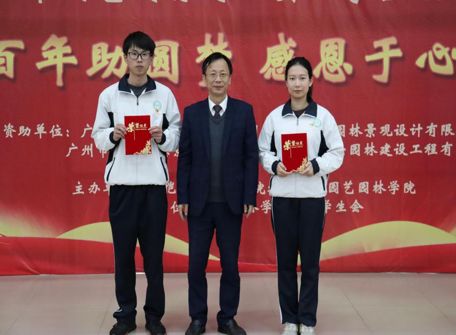 广州普邦园林股份有限公司首席专家谭广文为荣获2021年普邦精英奖学金的研究生和本科生颁发证书;广州茏腾园林景观设计有限公司品牌经理翁桂涛、生态景观所三所所长韦怡凯为“龙腾杯”获奖同学颁发证书;广州市白云园林建设工程有限公司风景园林施工工程师李秀华为荣获白云园建助学金的同学颁发证书;广州市尚景生态景观有限公司副总经理邓剑煊、设计总监陈洁分别为尚景园林设计大赛获奖同学和荣获尚景助学金的同学颁发证书。