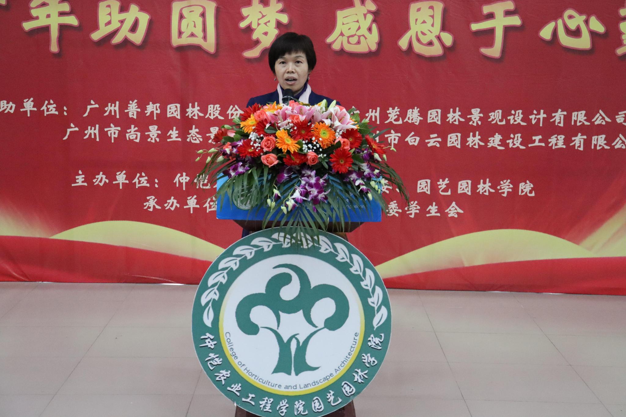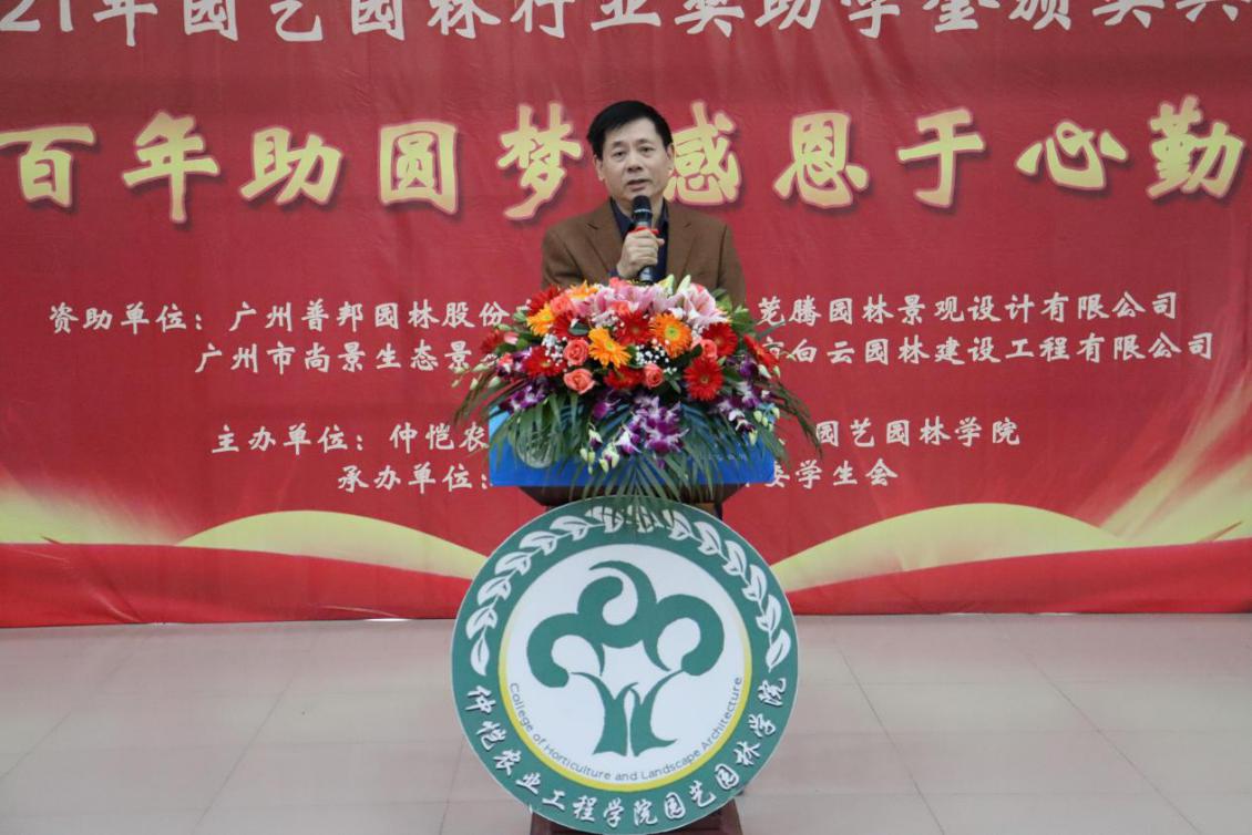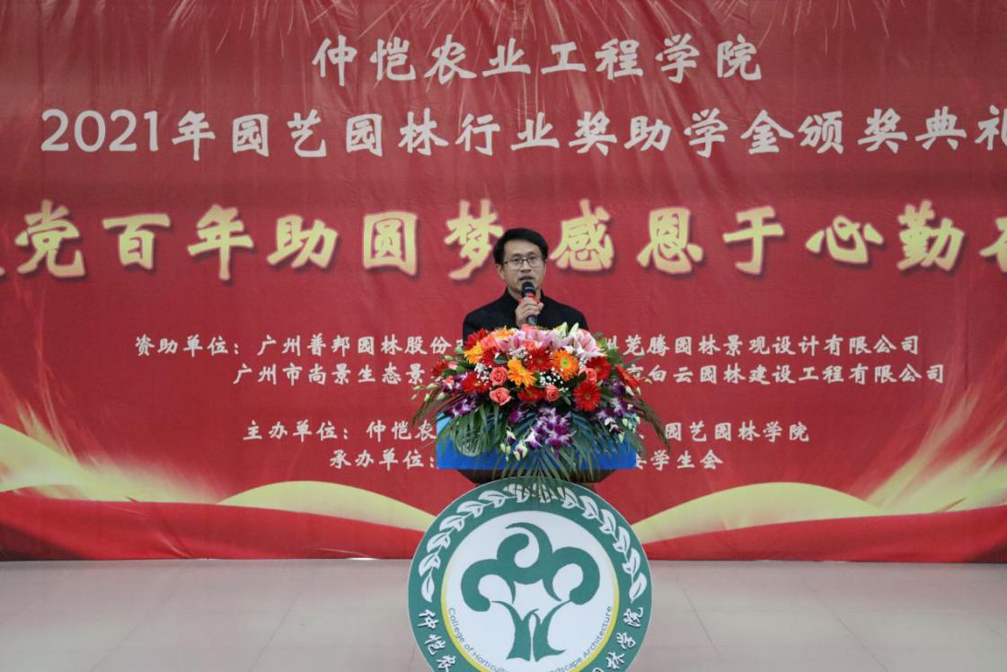 广州普邦园林股份有限公司首席专家谭广文发表讲话。他谈到多年来校企通力合作为企业输送了大量人才,也为同学提供了一个面对面了解景观行业企业的窗口,对学院辛勤栽培优秀同学表示感谢,同时他也希望同学们能全面发展,不忘初心,为实现自我价值而不懈努力。