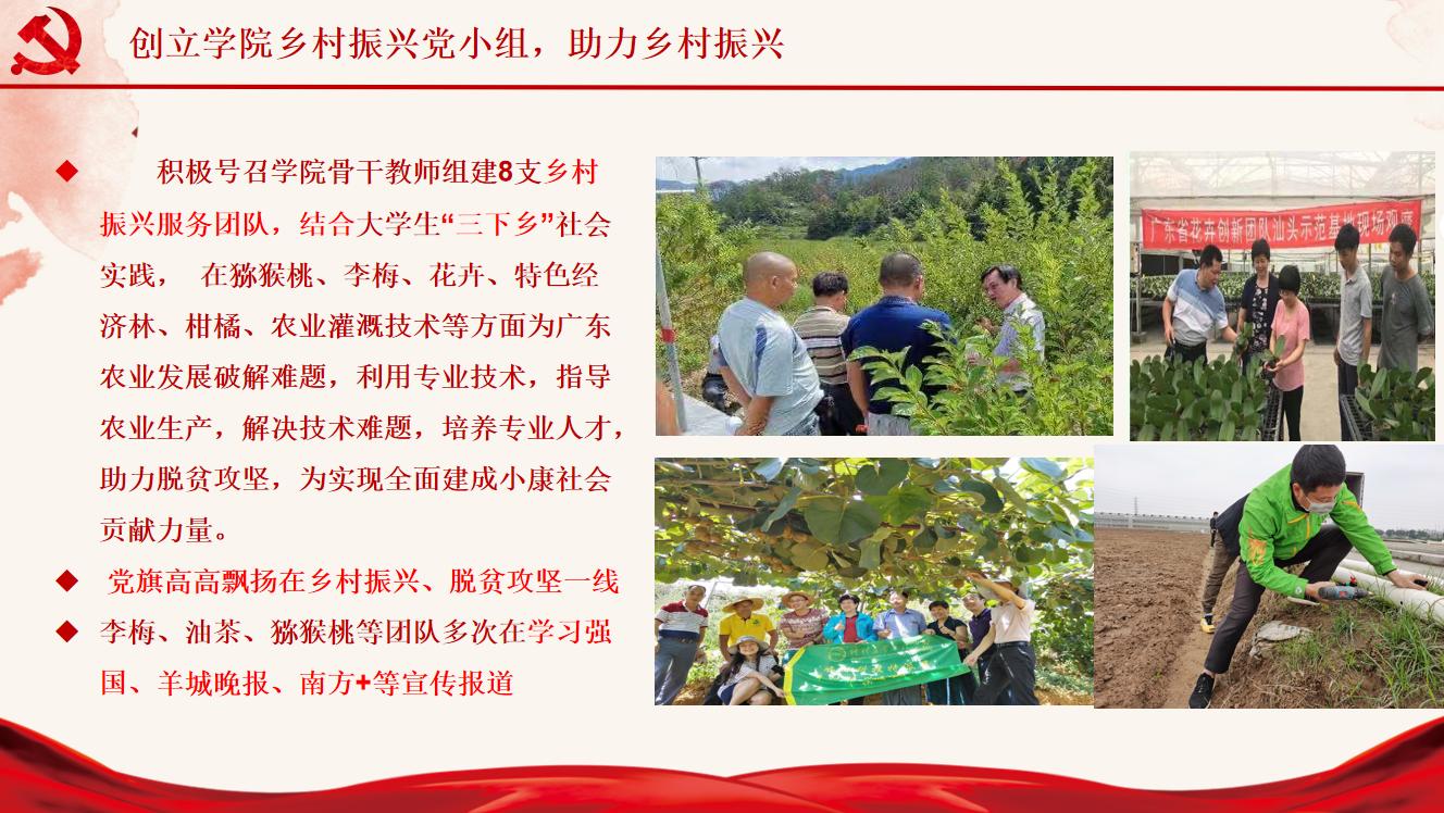 学院建立乡村振兴党组织,推动广东乡村振兴战略落地,根据学科、专业、产业特点组成8支乡村振兴服务团队,对接产业,服务广东农村地区,加快推进乡村治理体系和治理能力现代化。