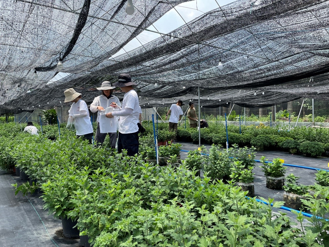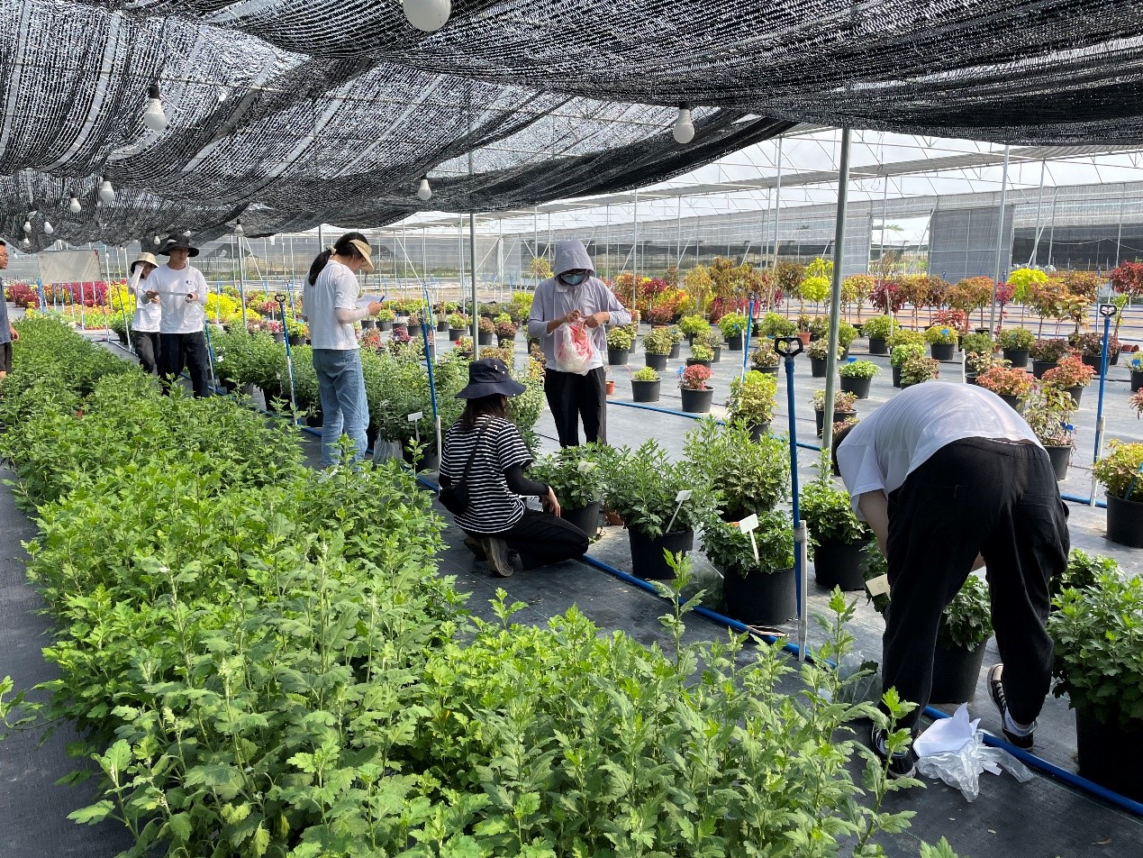 烈日当头,同学们无一退缩,发扬科研人吃苦耐劳的精神,始终坚守岗位。各小组认真观测彩叶草叶型、色彩、叶表网纹、分枝状况等指标,虚心向老师和厚德公司技术人员请教,给性状优良的植物挂上选育标签,记录数据和拍照。最后在大家辛苦劳作之下,一共选育出一百多个彩叶草候选新品种,虽然有点累,但收获满满。最后,课程还安排同学进行了菊花种质资源圃190个菊花品种的采穗、扦插等品种保种和扩繁的基本过程,