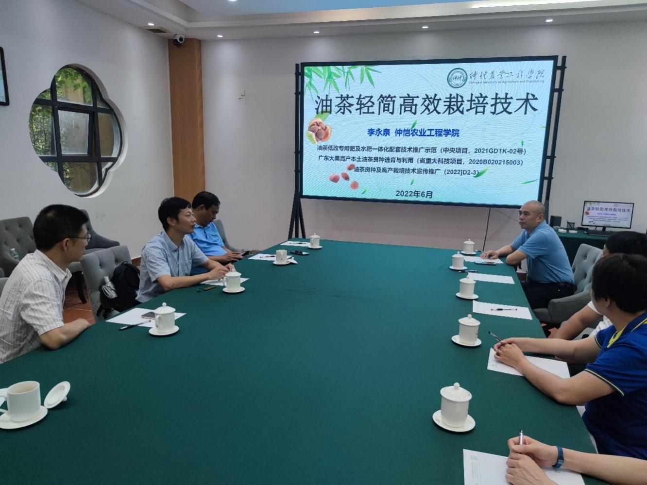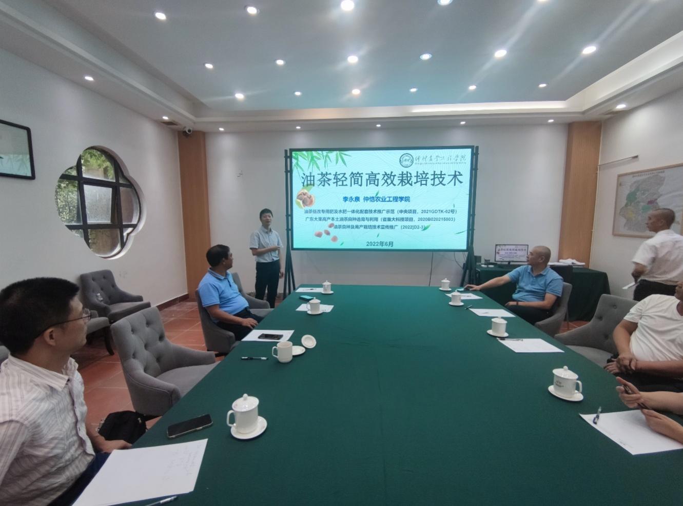 宣传推广座谈会在广东紫莲实业有限公司召开。参会人员包括潮州市林业局、紫莲公司和当地林农等11人。座谈会上,李永泉教授介绍了我校承担的“广东大果高产本土油茶良种选育与利用”、“油茶低改专用肥及水肥一体化配套技术推广示范”、“油茶良种及高产栽培技术宣传推广”等项目成果,并和参会人员交流探讨了潮州市未来可推广应用的油茶良种和丰产稳产栽培技术。会后双方达成了油茶栽培技术以及林地规划设计等合作意向。