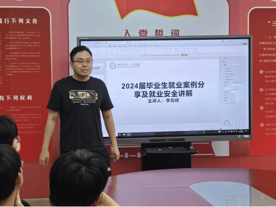 为树立大学生权益保护意识,保障学院2024届毕业生高质量就业,5月10日下午,m88在生命科学大楼B座607召开毕业生就业安全专题会,本次专题会邀请学校组织部科长卢昱静主讲,毕业班辅导员李剑峰以及毕业班各班学生代表参加此次会议。