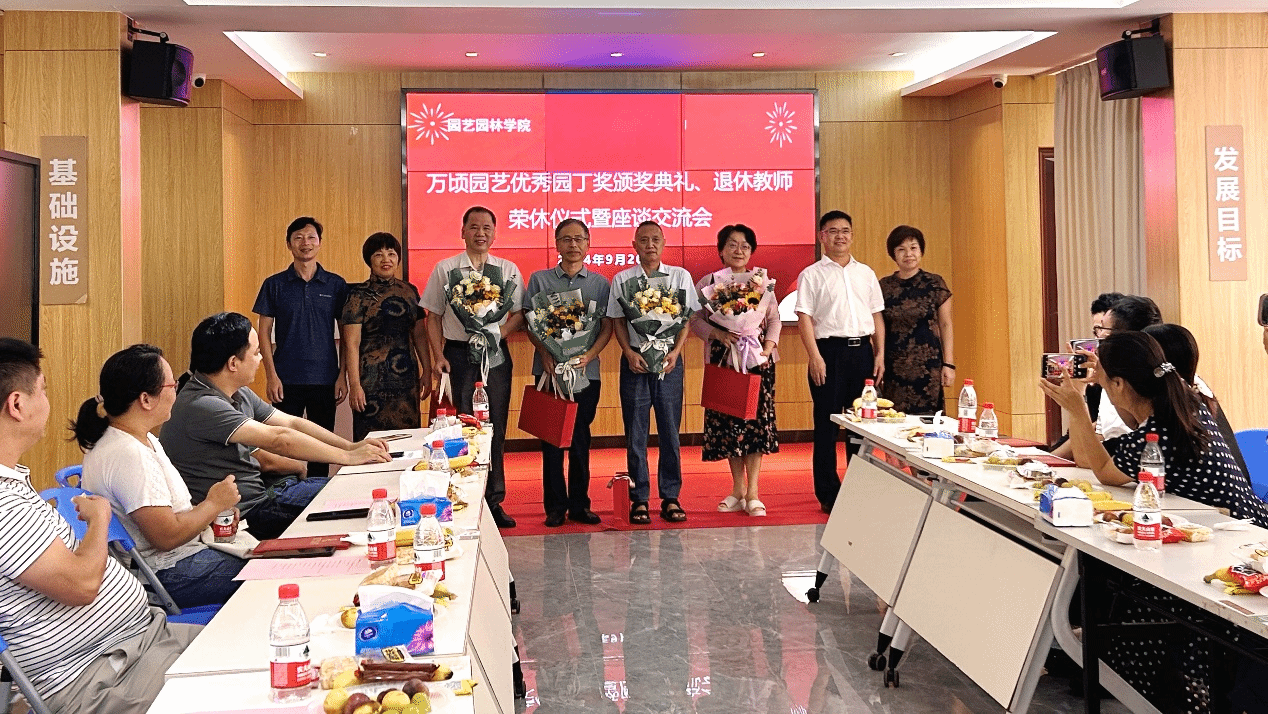 为庆祝我国第40个教师节,弘扬高尚师德师风,9月20日下午m88在海珠孵化园举办万顷园艺优秀园丁奖颁奖典礼、退休教师荣休仪式暨座谈交流会,学校人力资源部部长尹国强、校工会常务副主席吴雪君、学院党政班子、2024年退休教师以及中青年教师近40人参加活动。本次活动由学院党委书记陈晓玲主持。