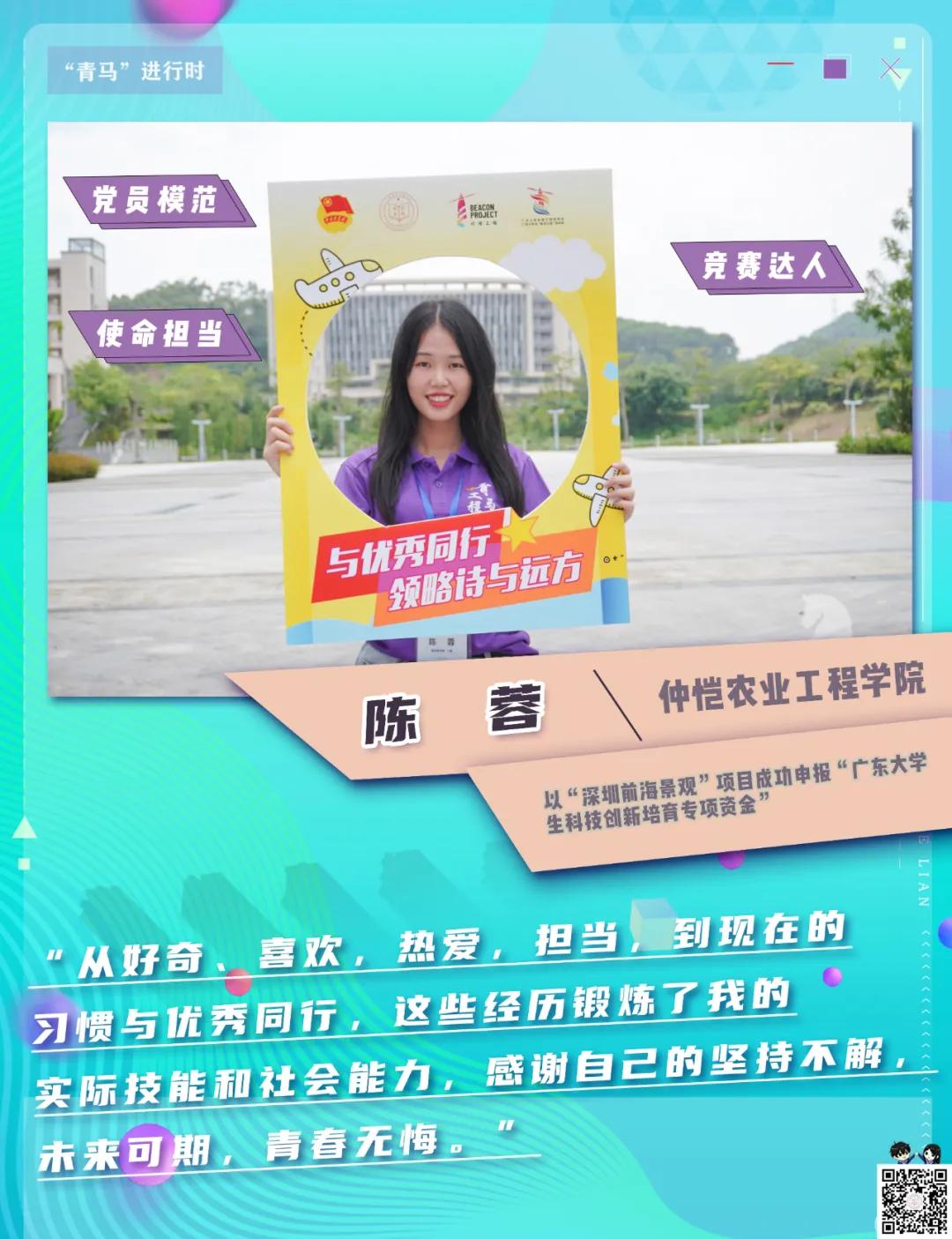 陈蓉,曾担任仲恺研究生第一党支部书记,同时兼任校级和院级研会主席,在校期间以主要负责人身份在多项领域斩获成果,其中获省级荣誉五项;曾获得“优秀研究生干部”、“优秀共青团干部、3项专项学业奖学金。中文核心期刊1篇(已收录),参编书籍一本《滨海生态营造技术》,参编海陆丰等多地市创园创森绿规等文件。