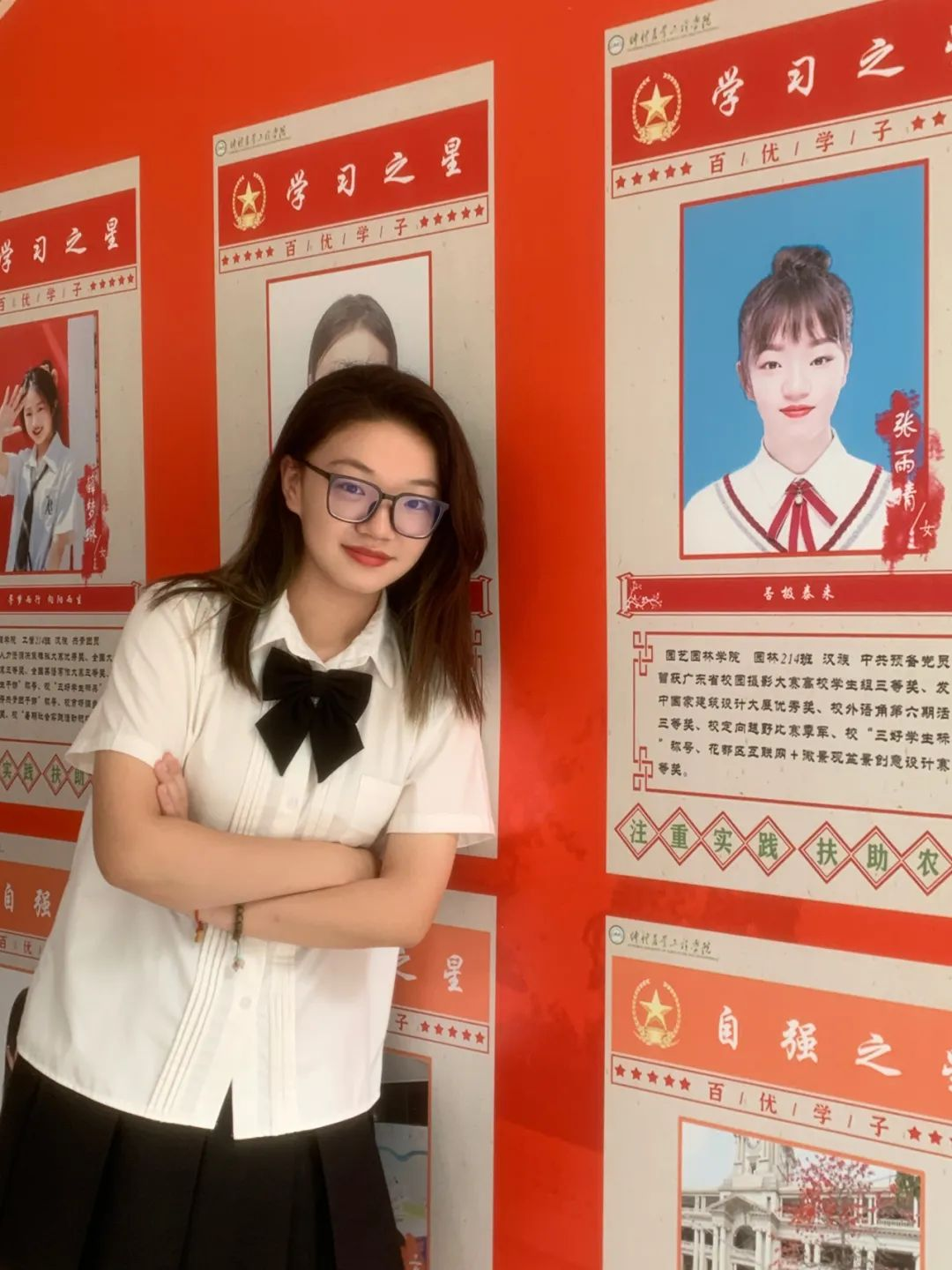 张雨晴,女,汉族,中共预备党员,就读于m88园林214班,曾任院办公室干事、院就业委副主任、院辩论队队长、学生党支部党务助理等6种职位。