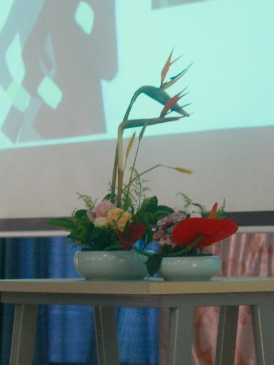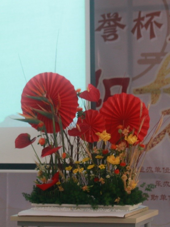 选手们对作品进行解说,带来既是艺术的视觉享受,也是爱党爱国精神的表达,各位选手阐述的故事更是引人入胜。压花作品展示完,紧接着插花作品的展示: