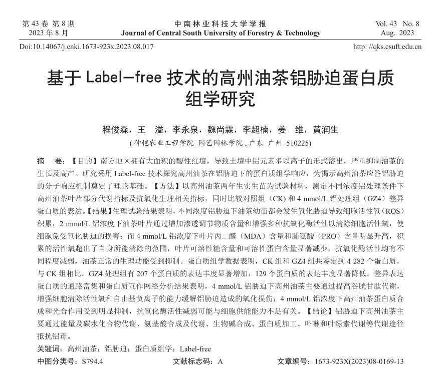 【目的】南方地区拥有大面积的酸性红壤,导致土壤中铝元素多以离子的形式溶出,严重抑制油茶的生长及高产。研究采用Label-free技术探究高州油茶在铝胁迫下的蛋白质组学响应,为揭示高州油茶应答铝胁迫的分子响应机制奠定了理论基础。