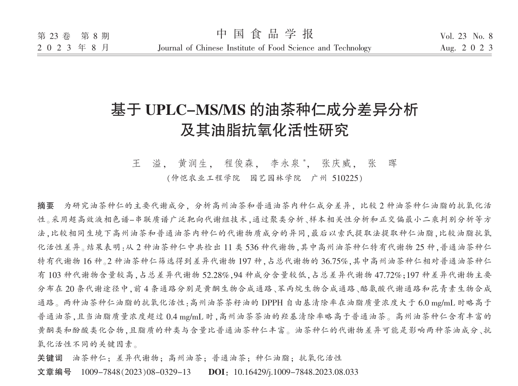 近日,m88李永泉,王溢教师团队在《中国食品学报》联合发表了题为“基于UPLC-MS/MS的油茶种仁成分差异分析及其油脂抗氧化活性研究”文章,采用超高效液相色谱-串联质谱广泛靶向代谢组技术,通过聚类分析、样本相关性分析和正交偏最小二乘判别分析等方法,得出了高州油茶种仁含有丰富的黄酮类和酚酸类化合物,且脂质的种类与含量比普通油茶种仁丰富这一研究结果。