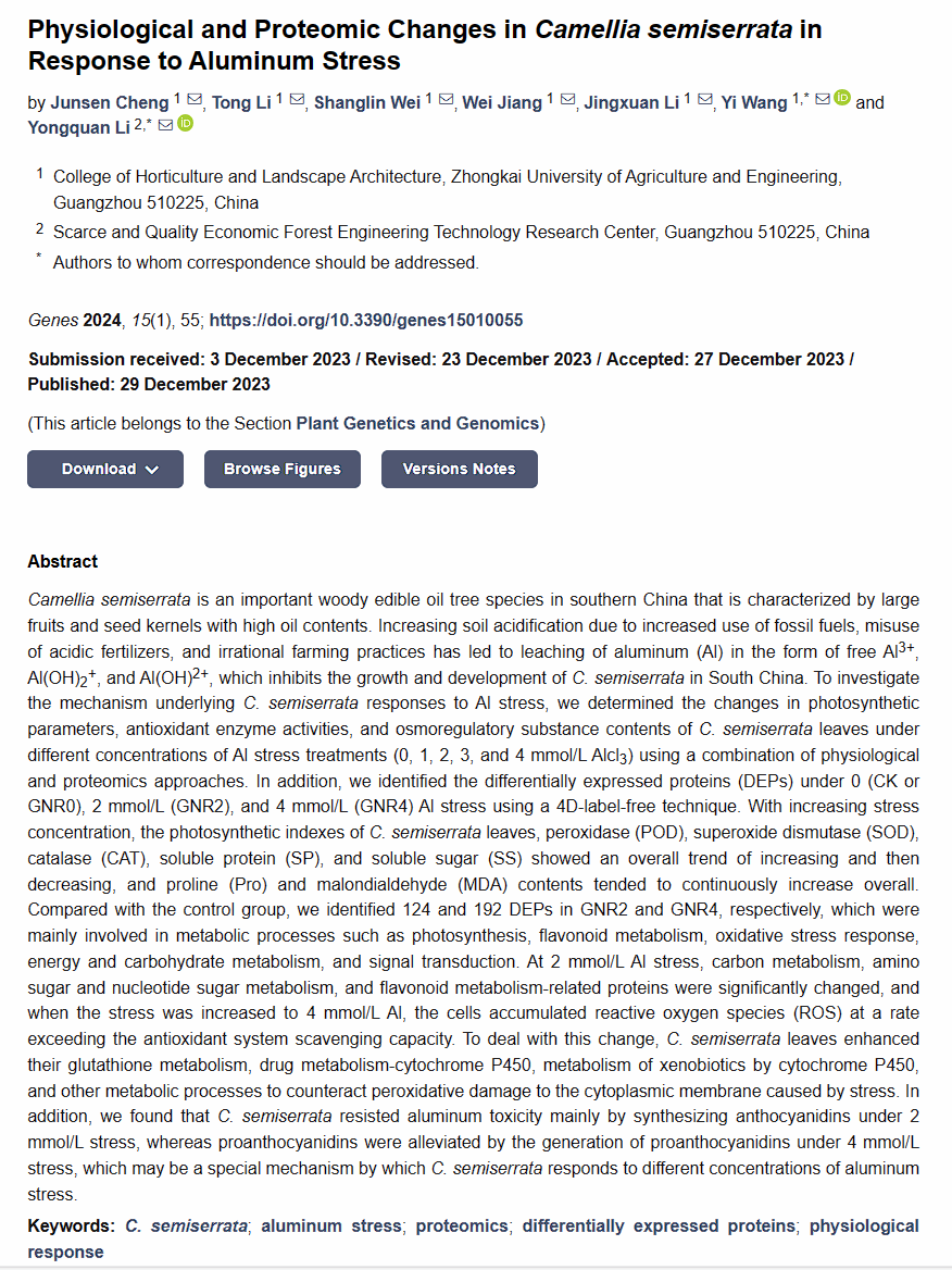 近日,m88教师李永泉、王溢指导的研究生程俊森,在《Genes》刊物发表了题为“Physiological and Proteomic Changes in Camellia semiserrata in Response to Aluminum Stress”文章,测定不同浓度铝处理条件下广宁红花油茶叶片部分代谢指标及抗氧化生理相关指标,同时比较对照组(GNR0)、2 mmol/L铝处理组(GNR2)以及4 mmol/L铝处理组(GNR4)差异蛋白质的表达;并根据差异蛋白质的功能筛选了四类(光合作用相关蛋白、类黄酮生物合成相关蛋白、抗氧化性相关蛋白和碳水化合物代谢相关蛋白)与铝胁迫关系较为紧密的关键蛋白,为揭示广宁红花油茶应答铝胁迫的分子响应机制和耐铝候选基因的筛选奠定了理论基础。