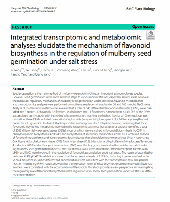 研究结论:通过综合转录组学和代谢组学分析,揭示了盐胁迫下桑树种子萌发过程中类黄酮生物合成的调控机制,发现关键基因和类黄酮代谢物在调控种子萌发过程中发挥重要作用,为探讨不同浓度盐胁迫下类黄酮生物合成对桑树种子萌发的调控作用提供了新的思路。