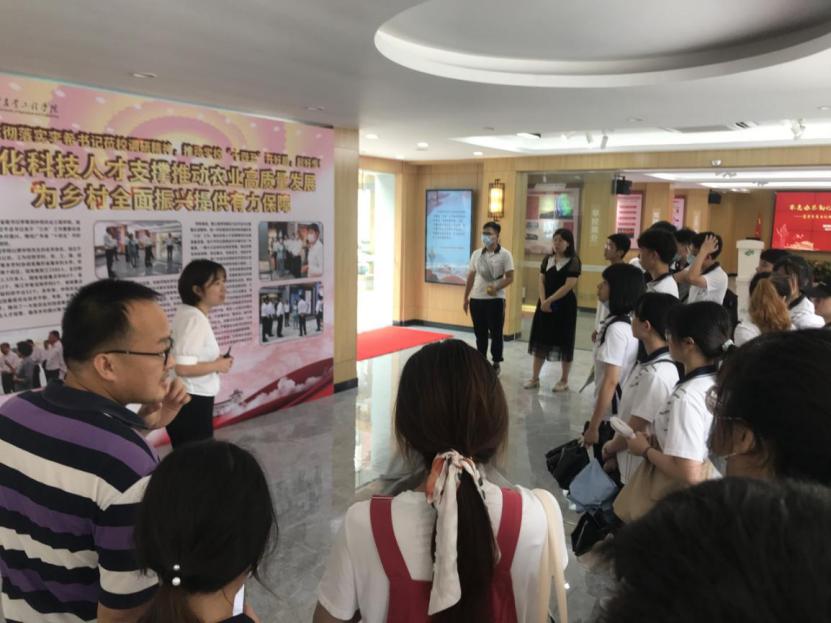 活动伊始,在讲解员的带领下师生党员参观孵化中心,讲解员按照学校简介-党建固基-【十三五】成绩-【十四五】成绩-科技支撑乡村振兴-人才支撑乡村振兴六大板块为我们讲解学校近年来的发展历程、发展目标和发展前景。